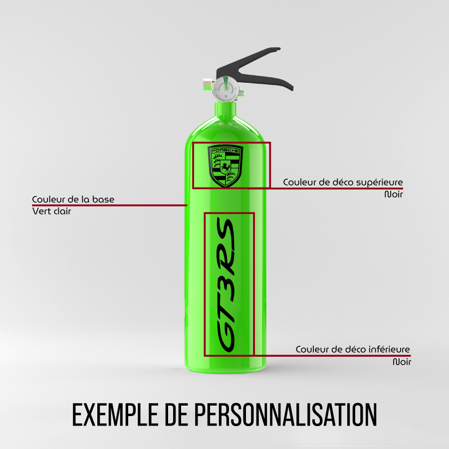 2. Personnalisation Sportive : À l’image de la personnalisation exclusive offerte par Porsche, cet extincteur vous permet de choisir la couleur de la base, de la décoration supérieure et de la décoration inférieure pour créer un ensemble qui reflète votre style unique.